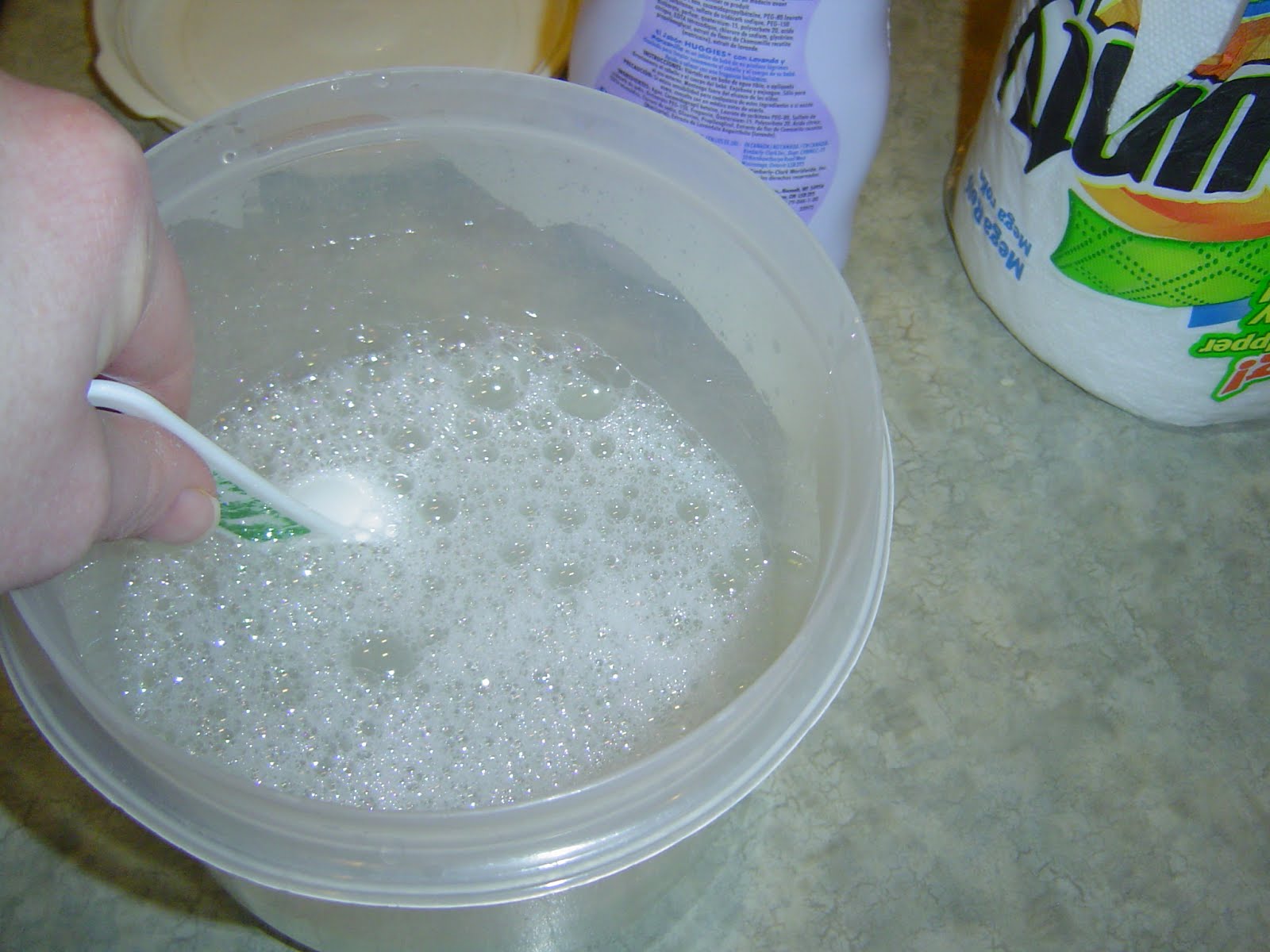 Careful when taking it out of the microwave - it's very hot and container will be soft. Pour in 1 T baby oil and 2 T baby wash.